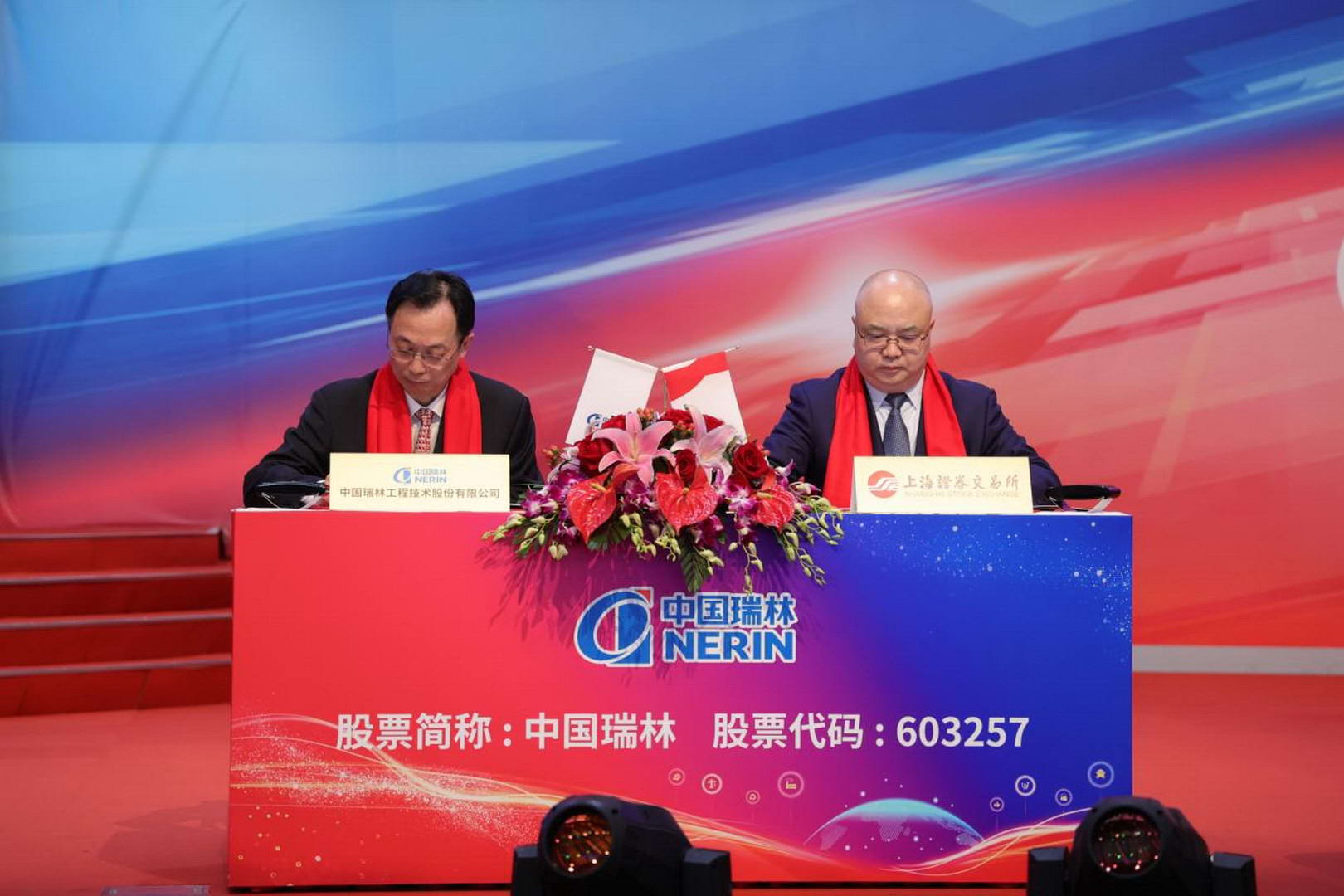 At the listing ceremony in the Shanghai Stock Exchange, Fu Hao, Deputy Director of the Global Business Development Professional Committee of the Shanghai Stock Exchange, and Zhang Xiaobo, Party Secretary and Chairman of China Nerin, signed the Securities Listing Agreement.