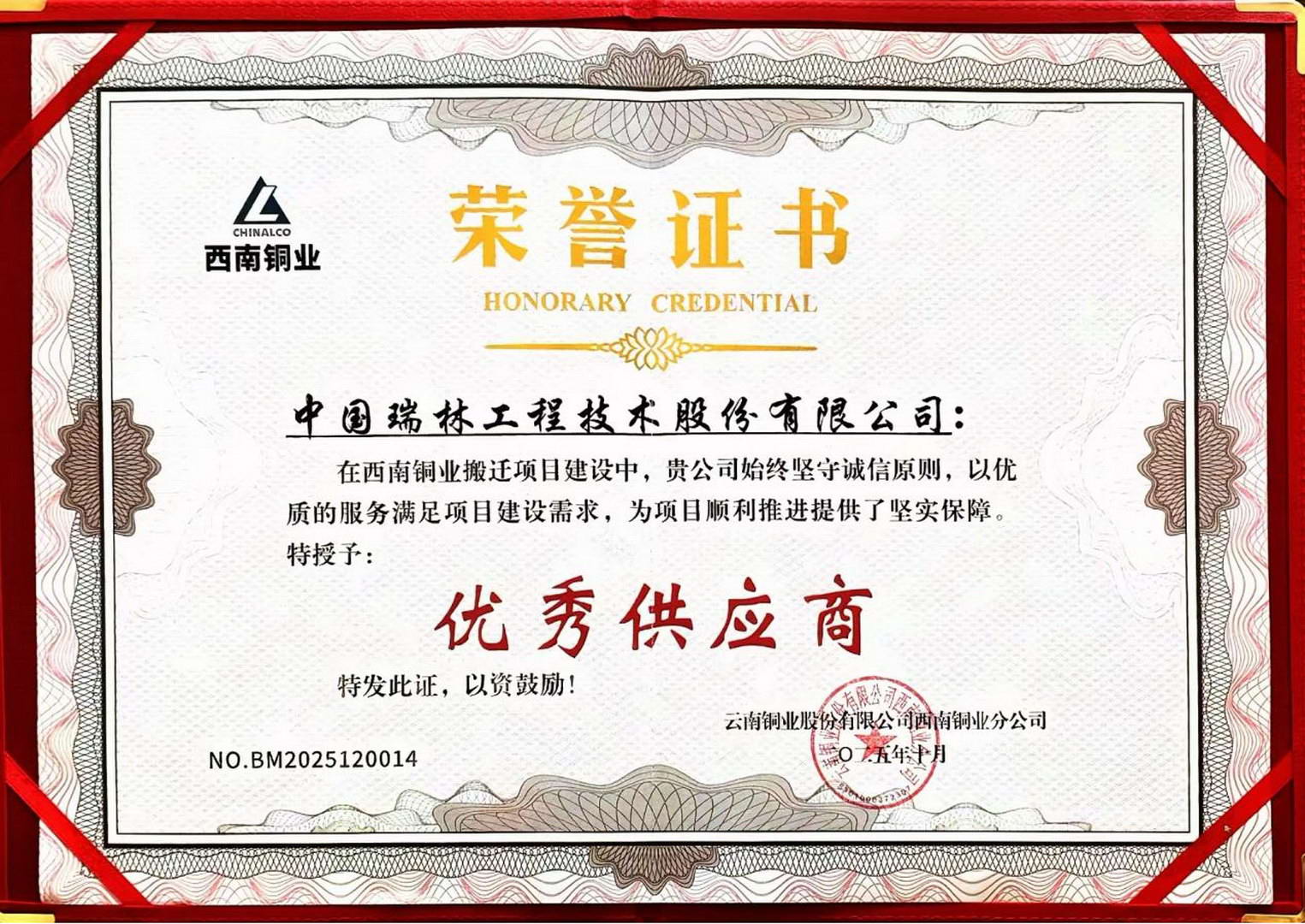 中國(guó)瑞林獲評(píng)云南銅業(yè)西南銅業(yè)搬遷項(xiàng)目“優(yōu)秀供應(yīng)商”